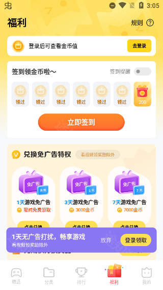 通过签到即可免费领取不同天数免广告权限