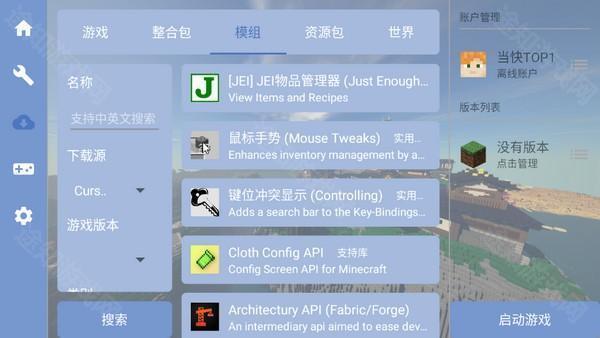 2、同样的就是模组下载,支持中文英文搜索,可以按下载源,游戏版本,类型等等进行挑选