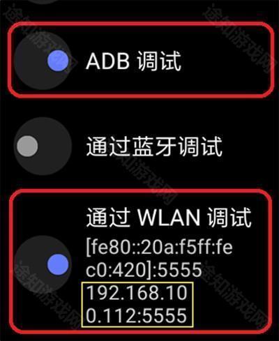 3、在开发者选项中,启用“ADB调试”和“通过WLAN调试”。保持在此界面,记下黄圈标注的IP地址和端口号。