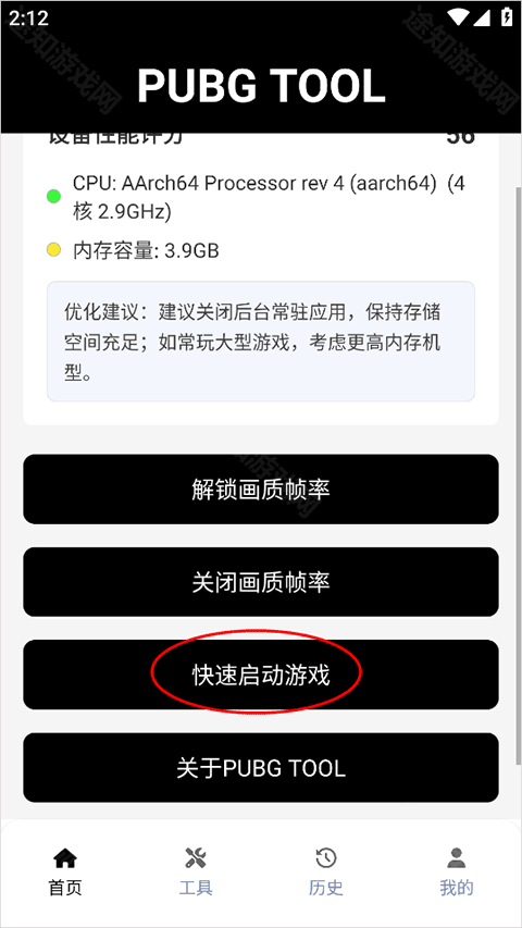 1、手机提前安装好和平精英游戏,下载安装本站提供的pubgtool画质助手官方版,然后打开软件可以看到相关的说明;