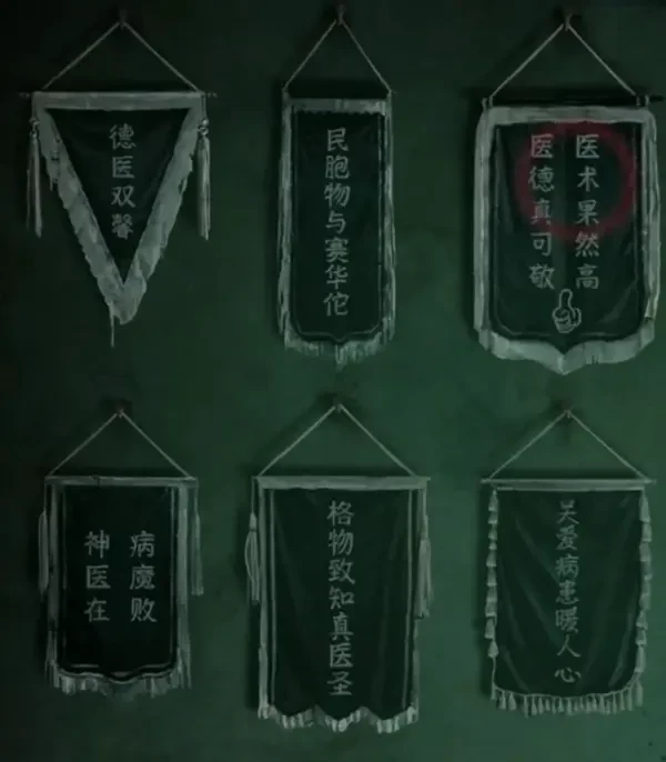 再查看一下锦旗,调整到对应第一行是【双胞然】第二行是【在格爱】,只要有这几个字就行不在乎位置的,调整完毕如下图,注意停尸柜打开小高能,从打开的柜门里拿到【三炷香】,然后按照里面伸出的手指的位置挨个点,顺序为【2-1】【3-3】【1-3】,打开【1-3】之后就能拿到一个布娃娃了,可以下楼了。