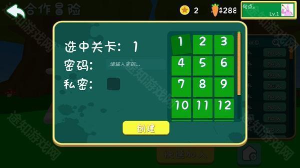 2、在该模式下右下角有一个带有“+”号的房子图标,点击即可创建房间,在此你可以选择关卡,也能输入密码以供好友进入。