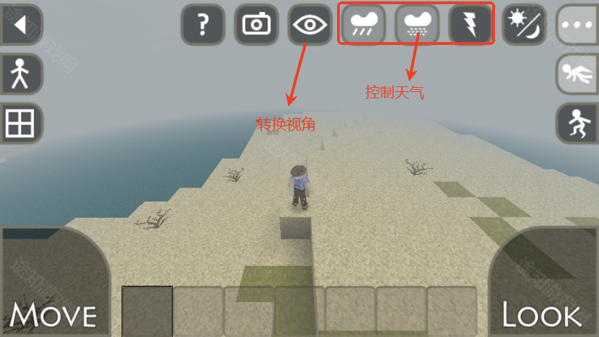 7、右上角还有控制天气的按键,如雨天、阴天、晴天等,眼睛图标可以调整游戏视角;