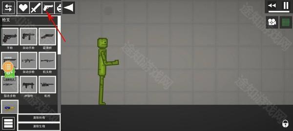 4、胳膊停住在空中停住之后,我们需要在左上角选择枪械图标去选择枪械;