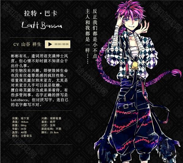 彬彬有礼,遣词用语充满绅士风度,但心情不好时就不知道会干出什么事。对生物没有兴趣,即便毁掉生命也没有丝毫罪恶感的疯狂性格。很重视芙露尔和米亚吉,尤其是对米亚吉几乎可以说是依赖。擅自将芙露尔当成弟弟看待,有些多管闲事。名字正确的拼写是LatoBacca,但讨厌写字,连自己的名字都写不对。