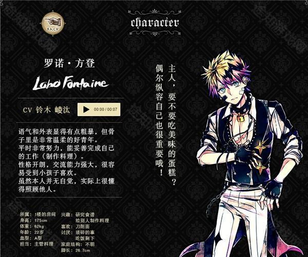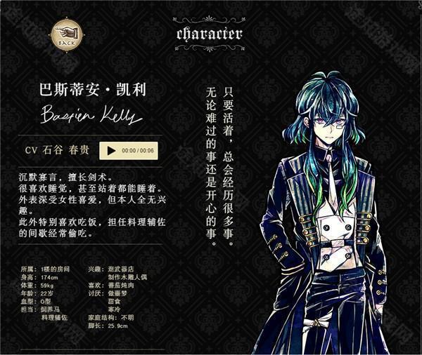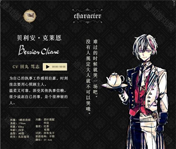 为自己的执事工作感到自豪。时刻挂念要用心照顾主人。温柔又可靠。深受其他执事信赖。很少说起自己的事,是个很神秘的人。