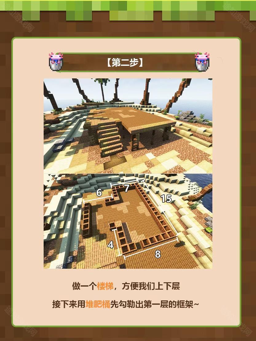1、在一片沙滩空地上搭建一个三格高的小平台按图中大小搭建,混用不同材质的木板,提升质感~