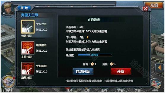 每艘舰船最多可有三个技能,其中普通攻击技能一个,主动攻击技能一个,旗舰技能一个(部分舰船无旗舰技能),所有类型的技能均可以进行升级。每个技能升级时消耗一定数量指定的道具,使用该道具后根据一定概率会有两种结果:技能升级成功、技能升级失败但熟练度增加