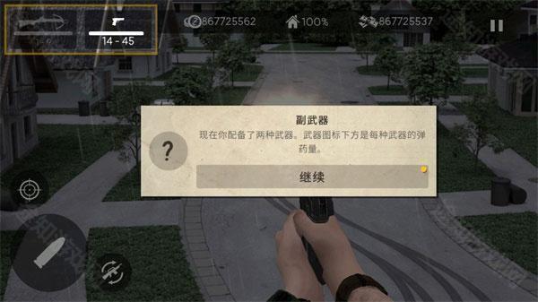6、现在你配备了两种武器,武器图标下方是每种武器的弹药量,要在武器间切换,可以轻触“切换武器”按钮;