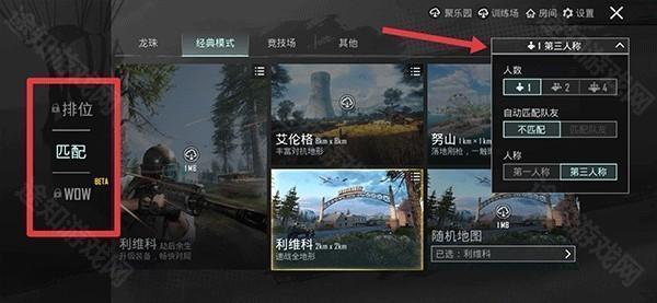 2、然后根据自己的喜好选择地图,点击右上角还可以选择单排、双排或四排