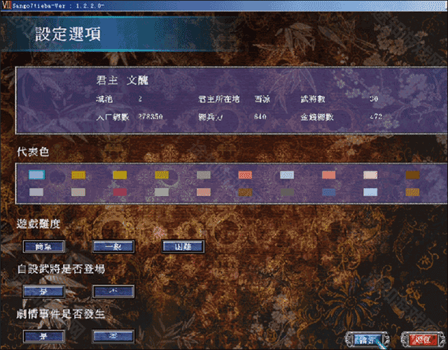 6、这里设定好自己方的颜色、游戏难度、自设武将等内容后选择并点击“确定”的按钮选项即可开始冒险了。