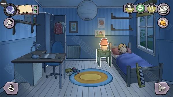 7、左上角显示的是一天的时间流逝。每次互动都会消耗时间,当夜晚到来时,记得让孩子按时入睡,结束这一天的生活。