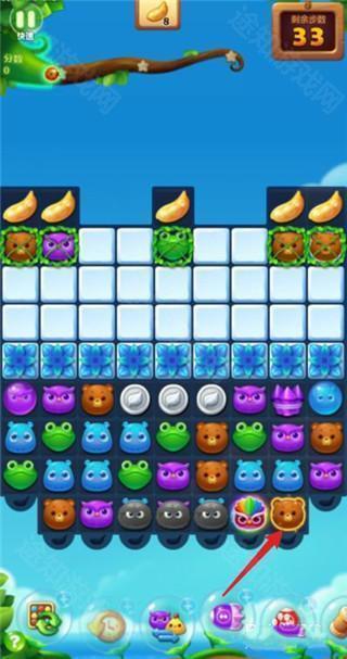组合四个动物为发光动物头,魔力鸟出现时和发光动物一起爆,即可消灭上方的大量冰块块。